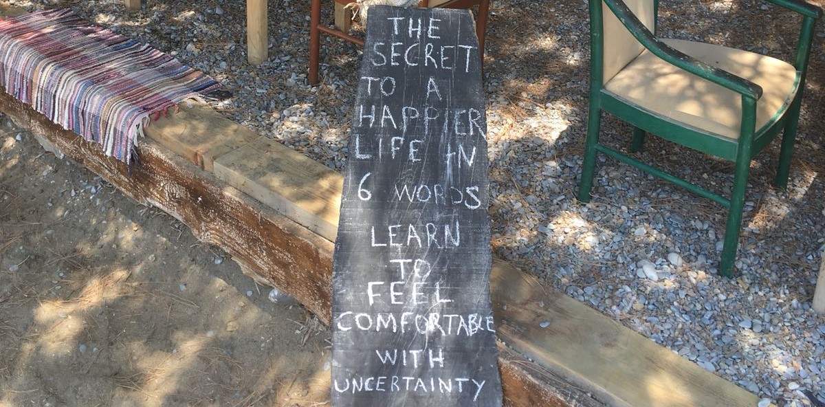De beloning is er na de beproeving van helling, beton, losse keien, gaten, kuilen en los grind op het strandpad. Het is een prachtige strandje waar “piraten” leven en wonen. We worden verwelkomd door een man met een ontbloot bovenlijf en hoofddoek om, met Bob Marley uit de stereo op de achtergrond, een levensgenieter. Een zeerover. “Welcome to our beach and taverna, you can use everything if you like and if you need anything to drink or eat just call me!”. De gastvrijheid is top en ik maak hem een compliment over zijn idyllische plek, “Very nice and beautiful here!”. Hij antwoord met humor en wijst naar zichzelf, “A beautiful place for beautiful people, thank you”. We lachen erom en hebben het goed bij hem aan zijn strandje net als zijn andere gasten. Dan valt mijn oog op een bordje wat bij het trapje van de taverna staat. Er staat geschreven: “The secret to a happier life in six words: Lean to feel comfortable with uncertainty”. Ik denk dat dit mij niet altijd lukt, maar als ik en wij allemaal daar inderdaad een stukje van kunnen vinden en terug kunnen brengen in onze maatschappij ontstaat er ruime voor onverwachte ervaringen en belevenissen.